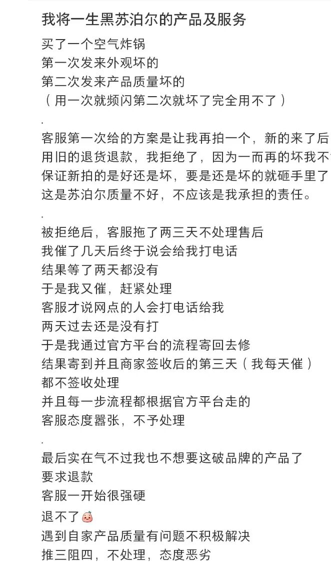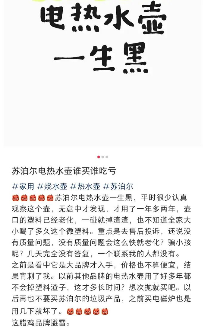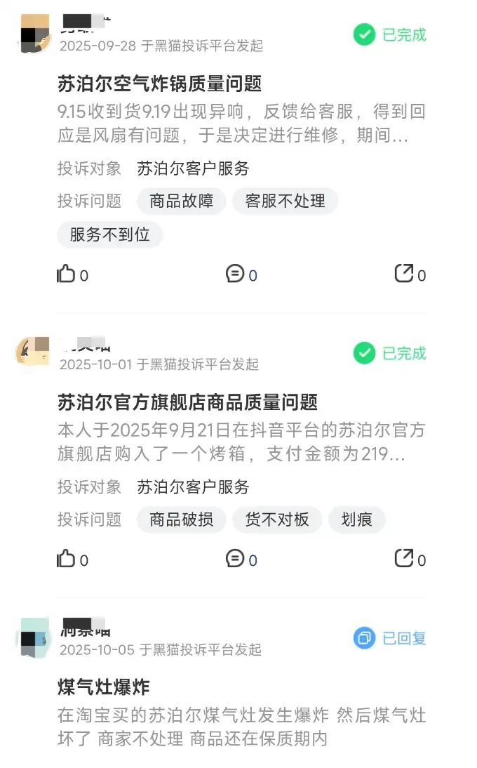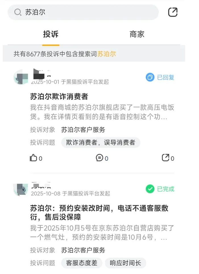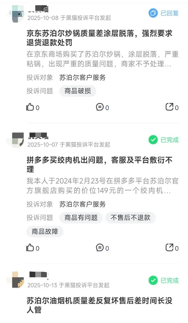 ▲(图源:公告)当外部结构如此脆弱时,近年来苏泊尔的产品安全问题不时引发关注。在黑猫投诉[下载黑猫投诉客户端]平台上,有超8000条关于苏泊尔的投诉,多款产品被曝存在安全隐患,包括煤气灶爆炸、炒锅涂层脱落、玻璃盖爆炸、电煮锅底部进水导致线路短路等。