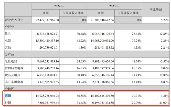 内销方面,苏泊尔面临增长停滞的严峻挑战。根据年报显示,2021年至2024年,苏泊尔内销业务增速从10.8%骤降至-1.21%。2024年,内销业务占总营收66.55%,下降1.21%。