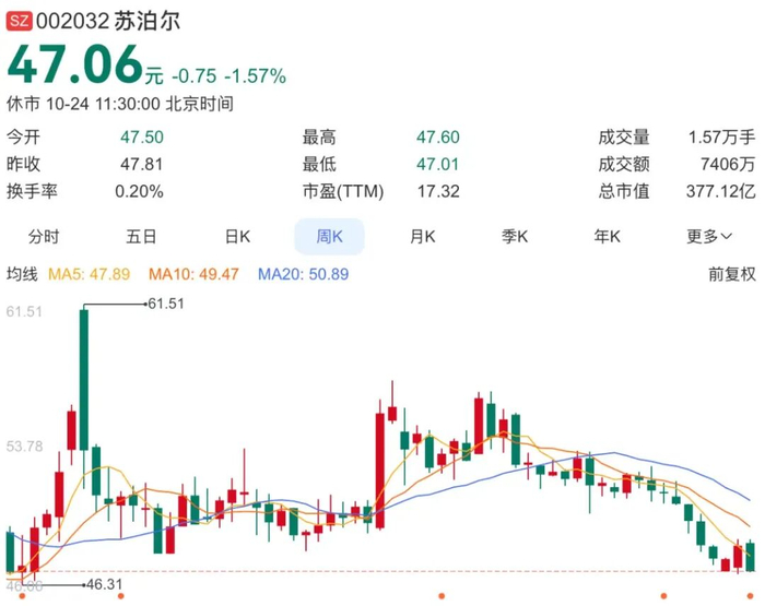二级市场上,截至10月24日午间休市,苏泊尔股价下跌1.57%报47.06元/股,最新市值377.12亿元。今年以来苏泊尔股价微跌5%,与大盘走势背离,昔日“锅王”似乎正被市场重新估值。