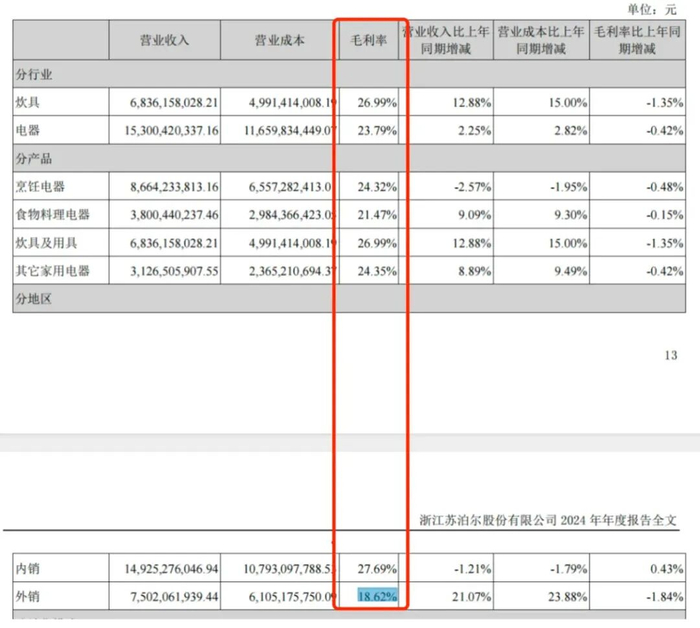 此外,外销业务以代工为主,毛利率长期低于内销。2024年,苏泊尔外销毛利率约18.62%,而内销毛利率为27.69%。这种结构性差异,使得公司整体盈利能力更易受到低毛利外销业务波动的影响。