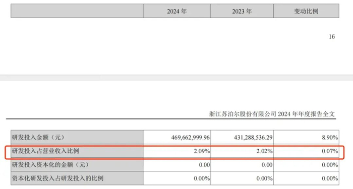 而安全问题的背后,更深层次的是创新。苏泊尔的研发投入长期偏低。根据年报显示,苏泊尔2024年研发费用约为4.70亿元,仅占到营收的2.09%。与之形成鲜明对比的是,苏泊尔2024年豪掷22.39亿元用于分红,分红率高达99.8%。